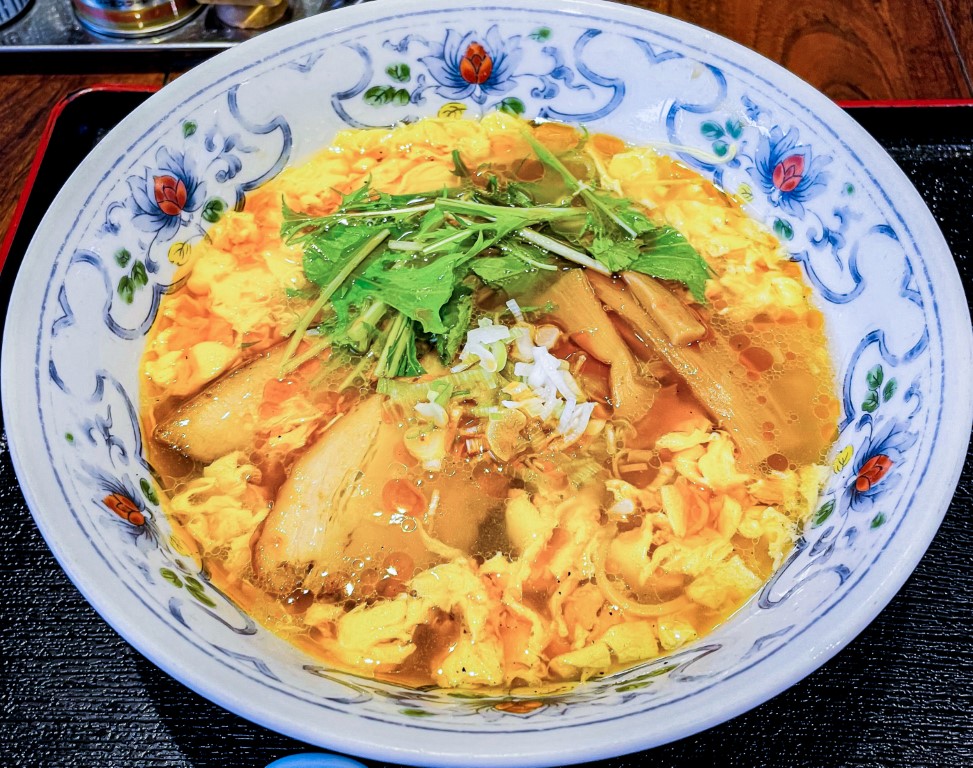 卵に火が通ったら器に移し、別鍋でゆでた麺を湯切りしてスープに入れ具材などをトッピングしラー油をかけたら出来上がり!(酢・ラー油はお好みで調整してください。)