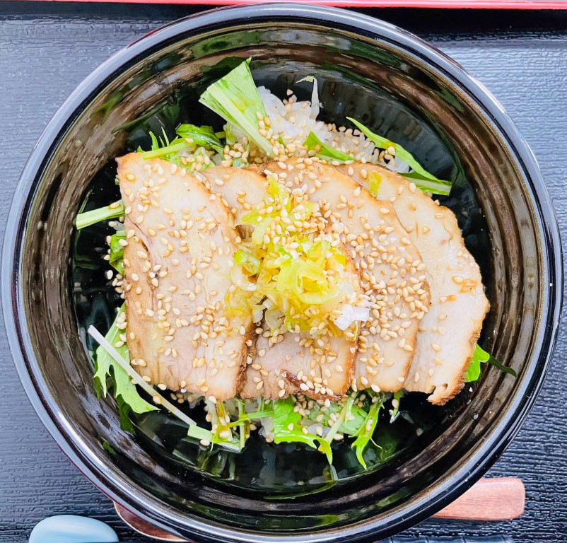 器に温かいご飯を入れ、水菜(お好みで)→温まったチャーシューを並べ、付属の特製ダレとごま油を上からかけてきざみネギとゴマをかけたら出来上がり!