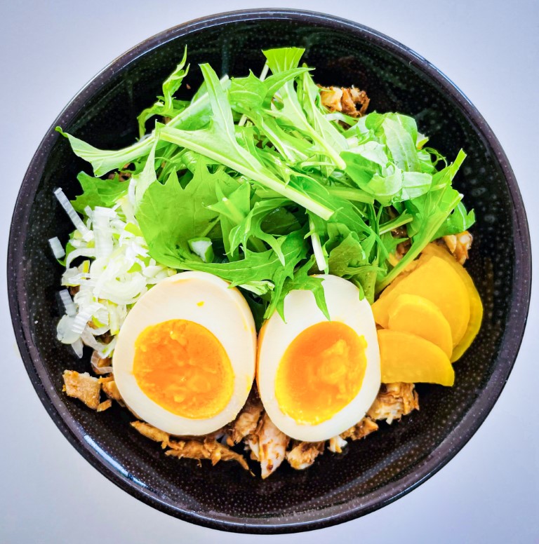 器に温かいご飯→きざみチャーシュー→きざみネギ→水菜→半熟煮卵の順番で盛り付ける。